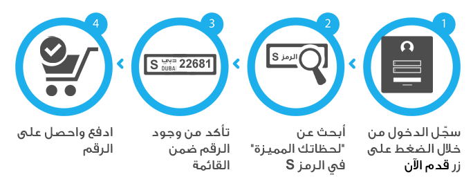 - يمكنك اختيار الرقم ضمن القائمة المحددة وشراء اللوحة مباشرة من خلال مراكز خدمة المتعاملين كافة في دبي، أو مزودي الخدمة، والشركاء الاستراتيجيين، وموقع الهيئة www.rta.ae أو التطبيق الذكي "السائقون والمركبات".